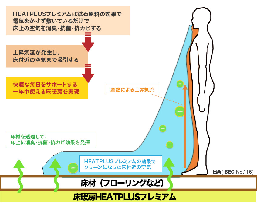HEATPLUSプレミアムの原料の効果で床の空気を抗菌・抗カビ・消臭します。